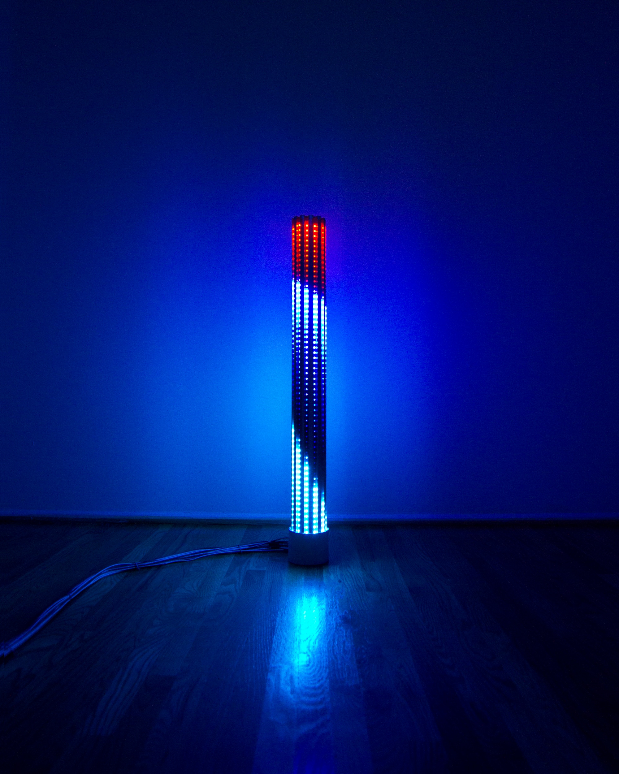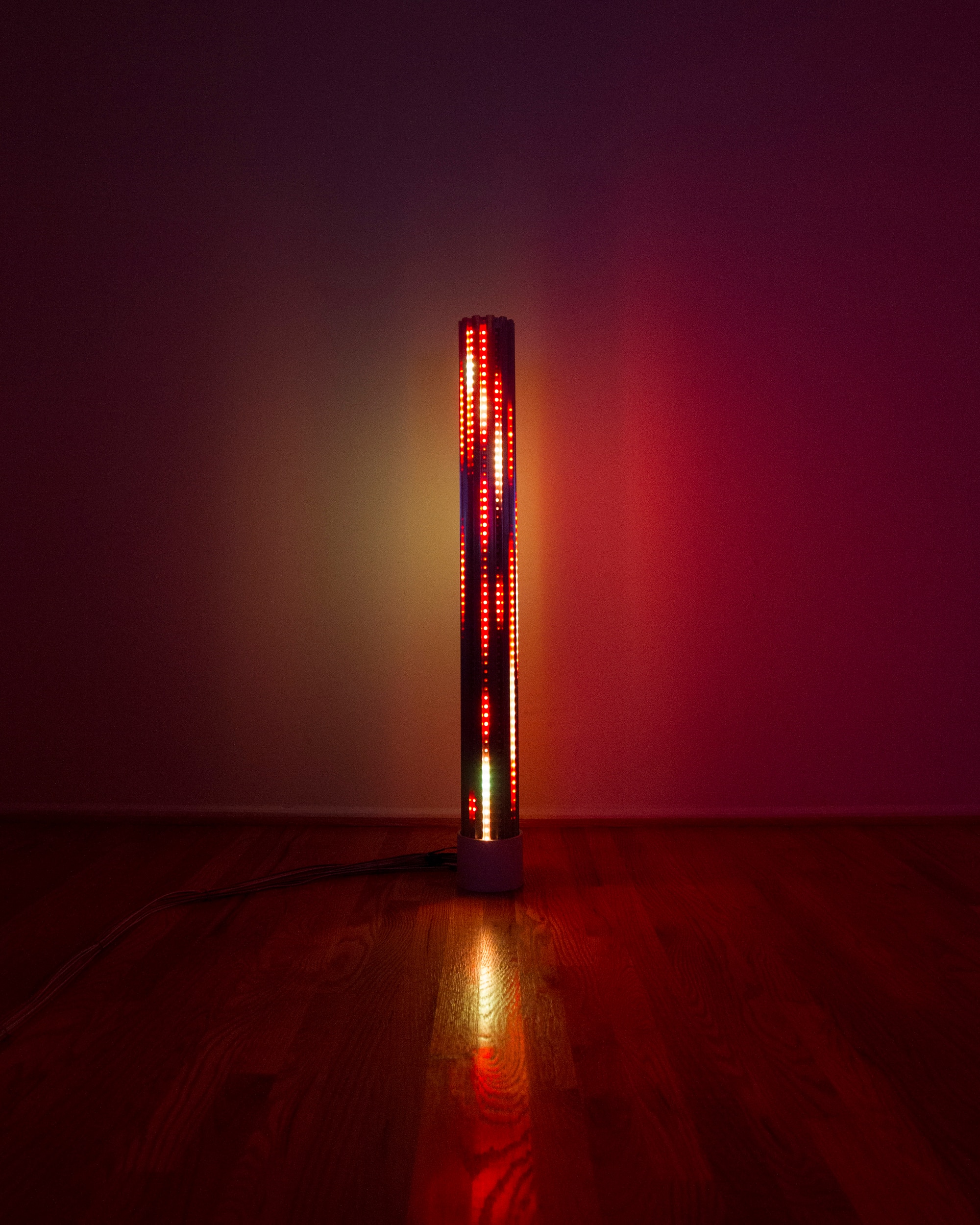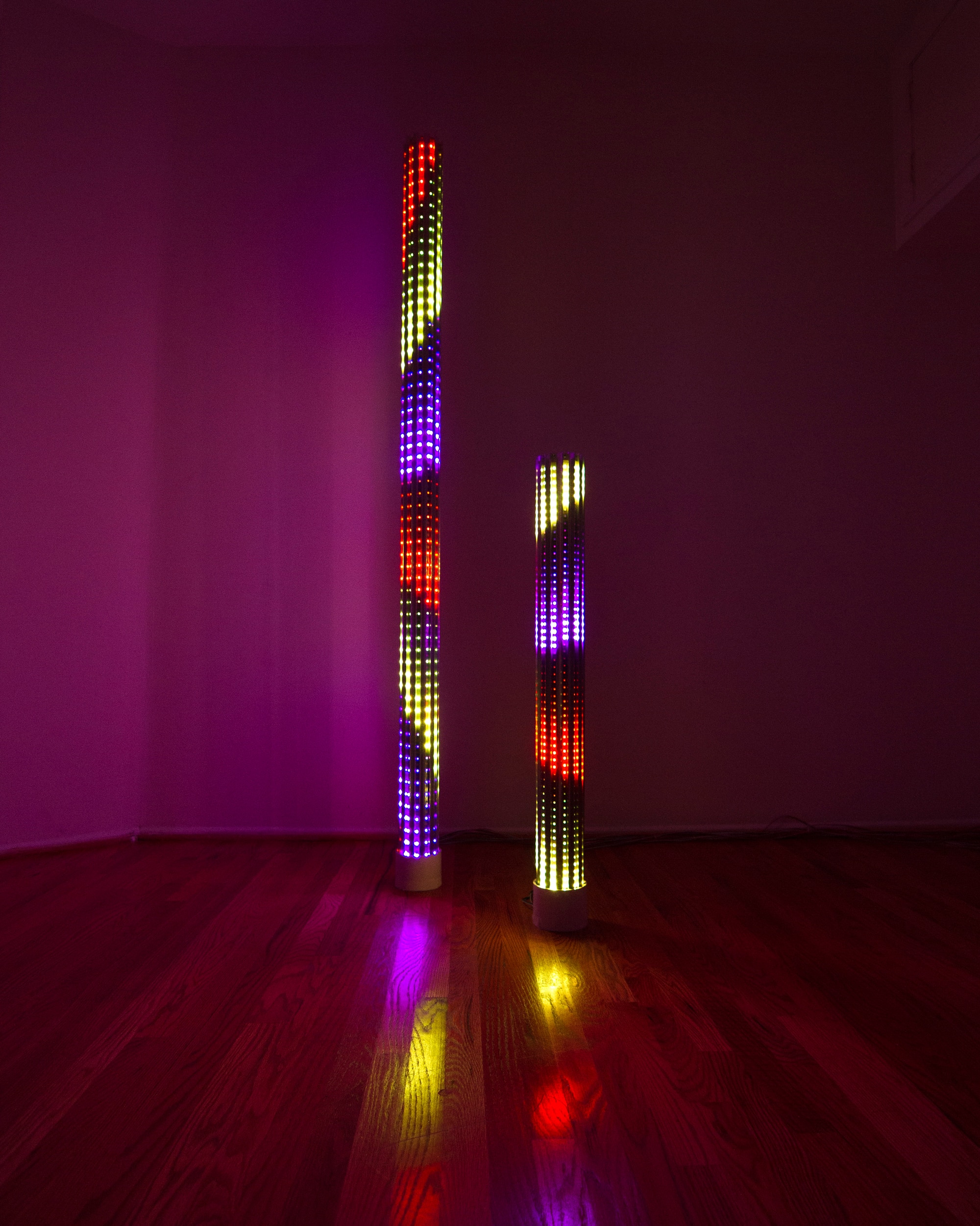 "Columns" reimagines vertical geometric forms as responsive light structures, combining custom LED displays with real-time generative content. Each piece reacts dynamically to its environment, producing immersive visual patterns that shift with presence and perspective. Developed as part of the "Elements" series, "Columns" exemplifies the modular adaptability and spatial transformation at the heart of this evolving body of work.