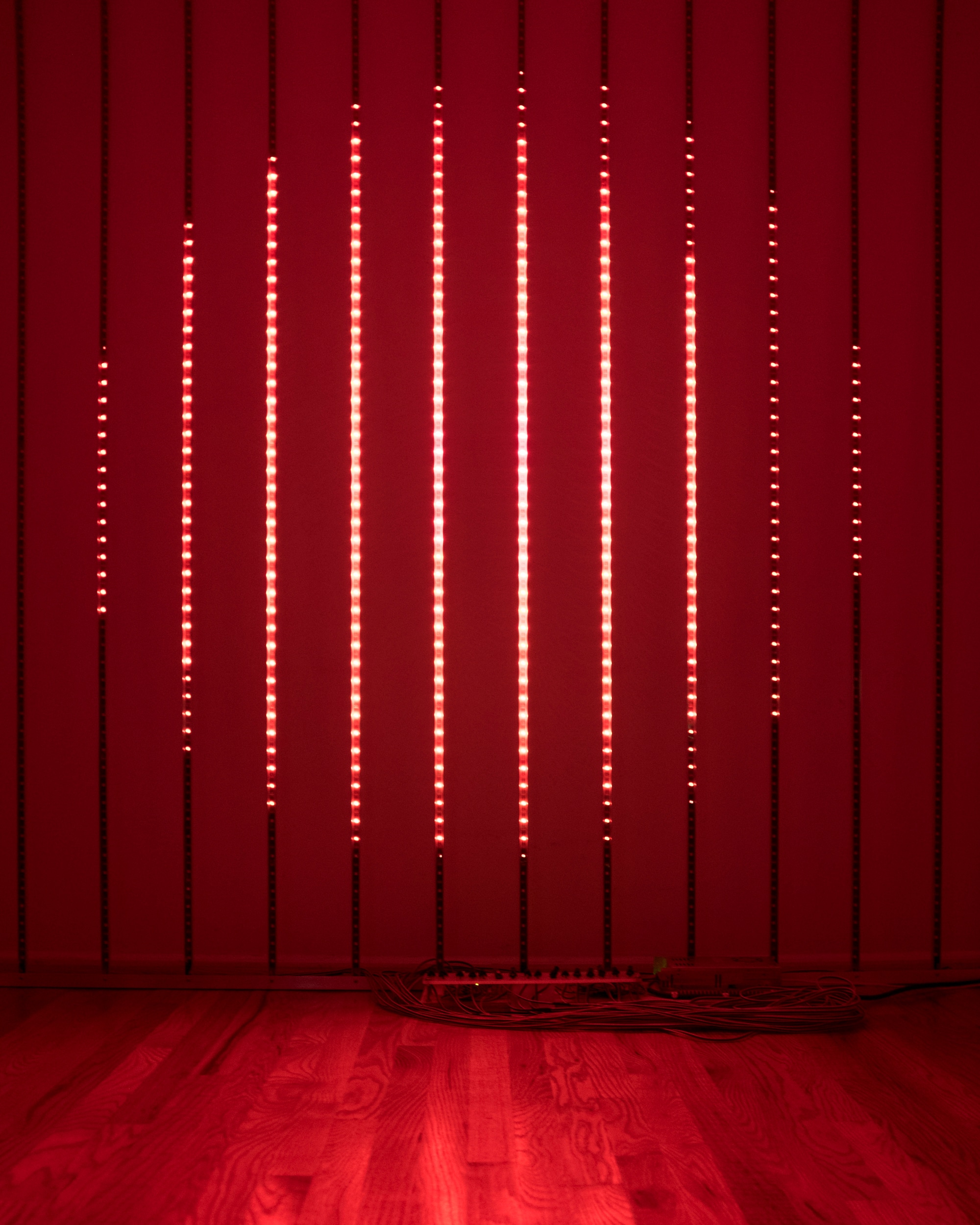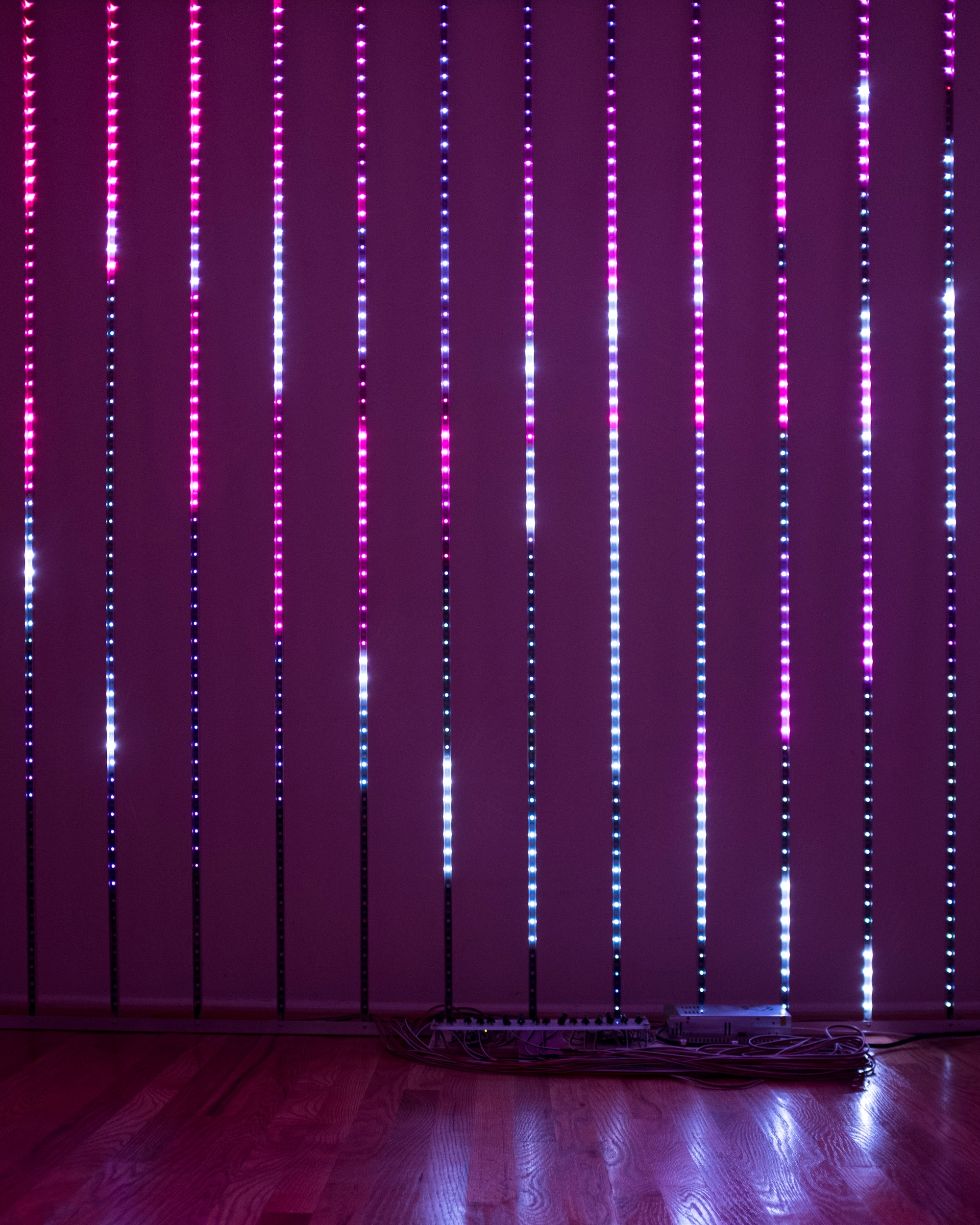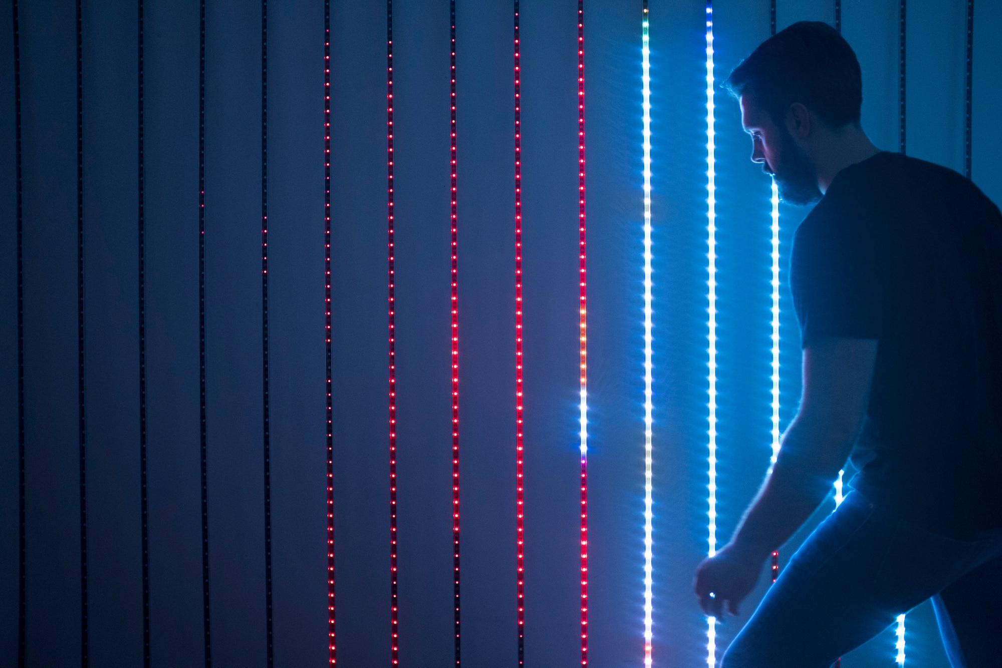 "Fence" is a modular light installation that uses generative systems to translate movement into evolving visual patterns. Built from custom LED components and minimal geometric structure, it responds in real time to presence and interaction, creating a dynamic experience that shifts with every viewer. Designed as part of the "Elements" series, Fence exemplifies a scalable approach to immersive public art—flexible in size, site, and impact. In 2020, it was expanded into the large-scale installation "Fences", which further develops these concepts at architectural scale.