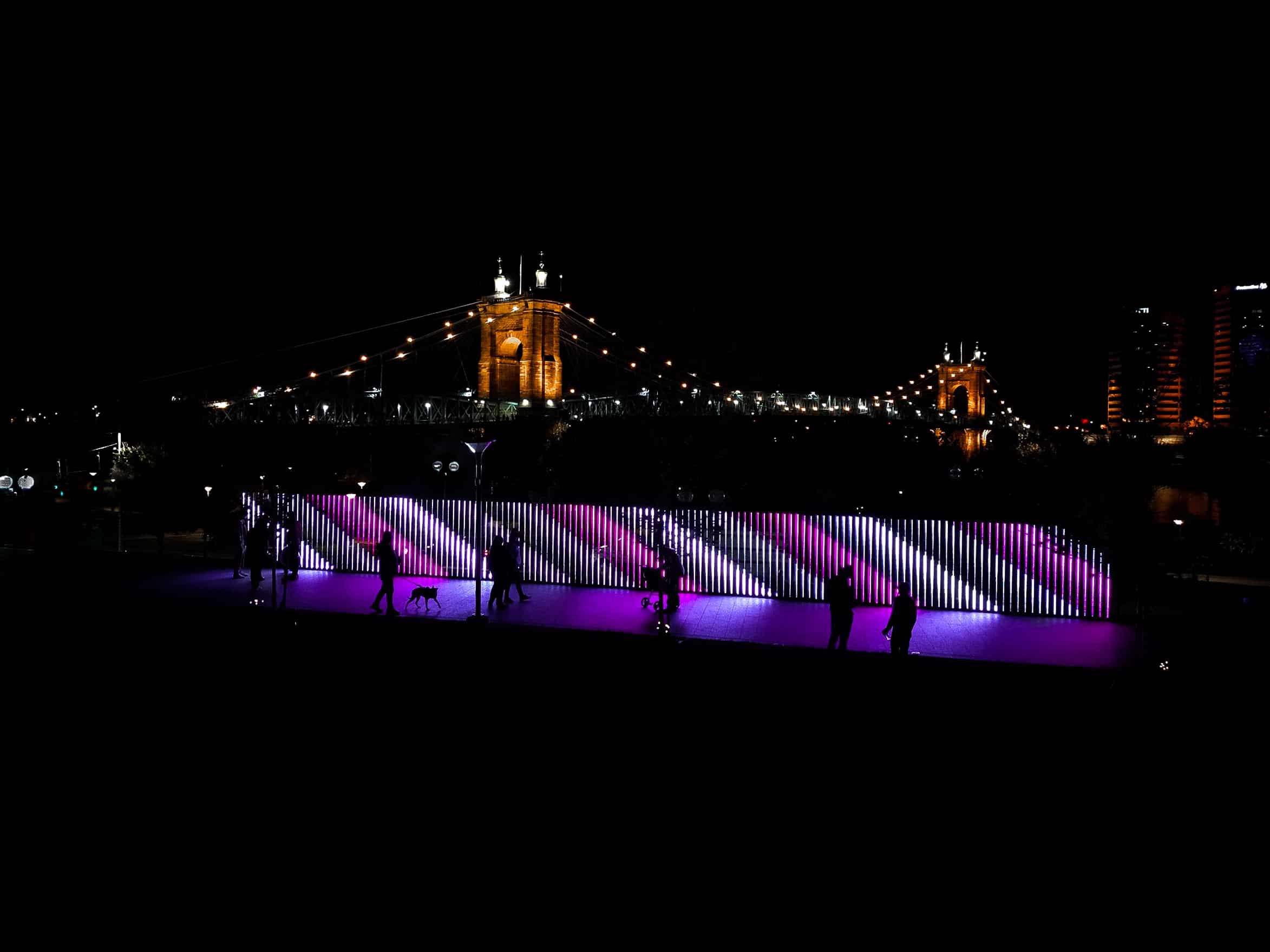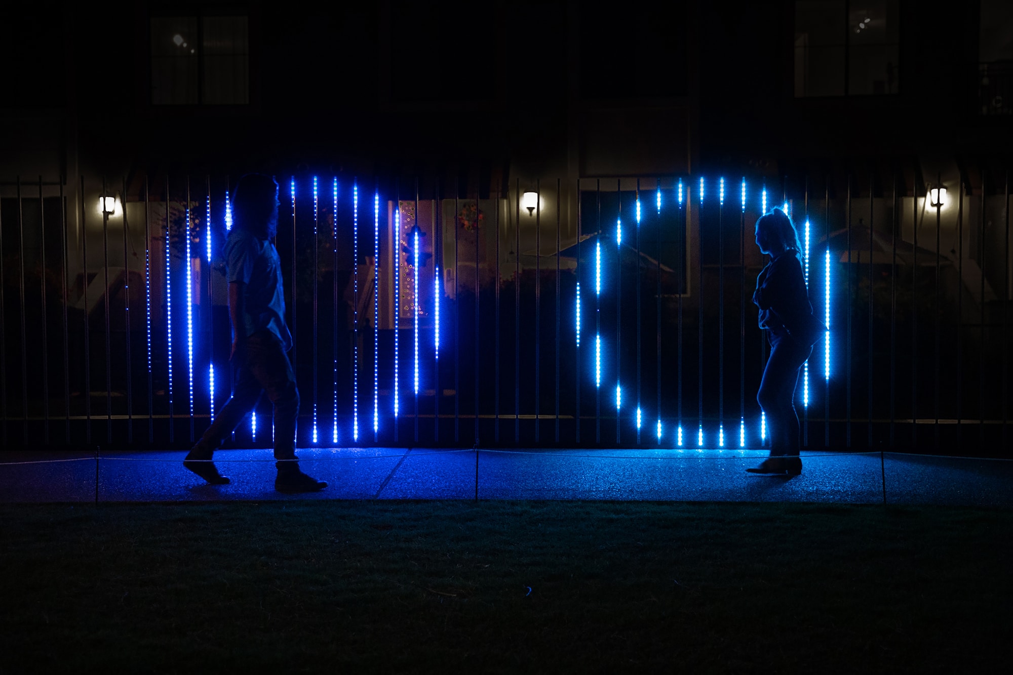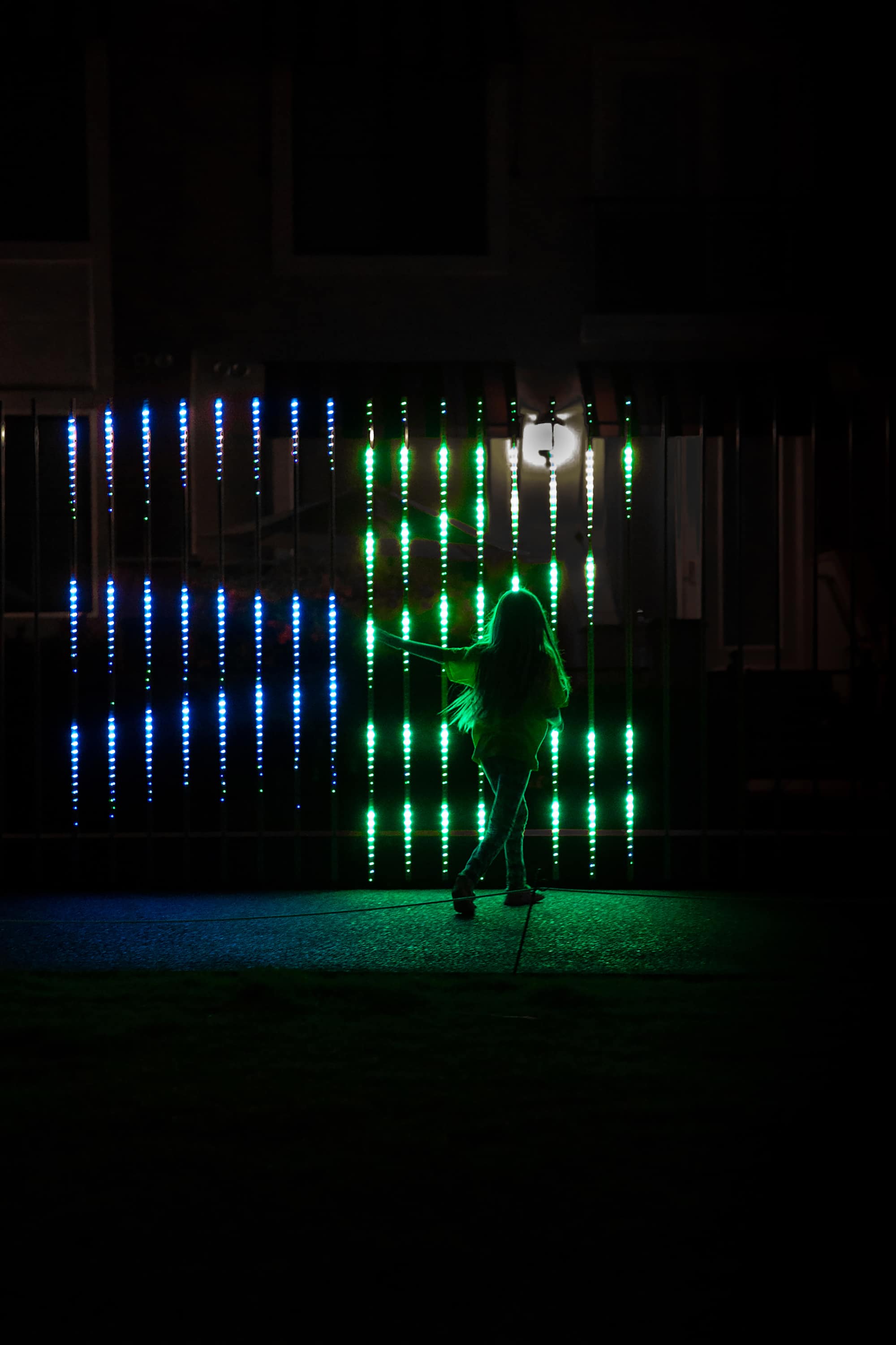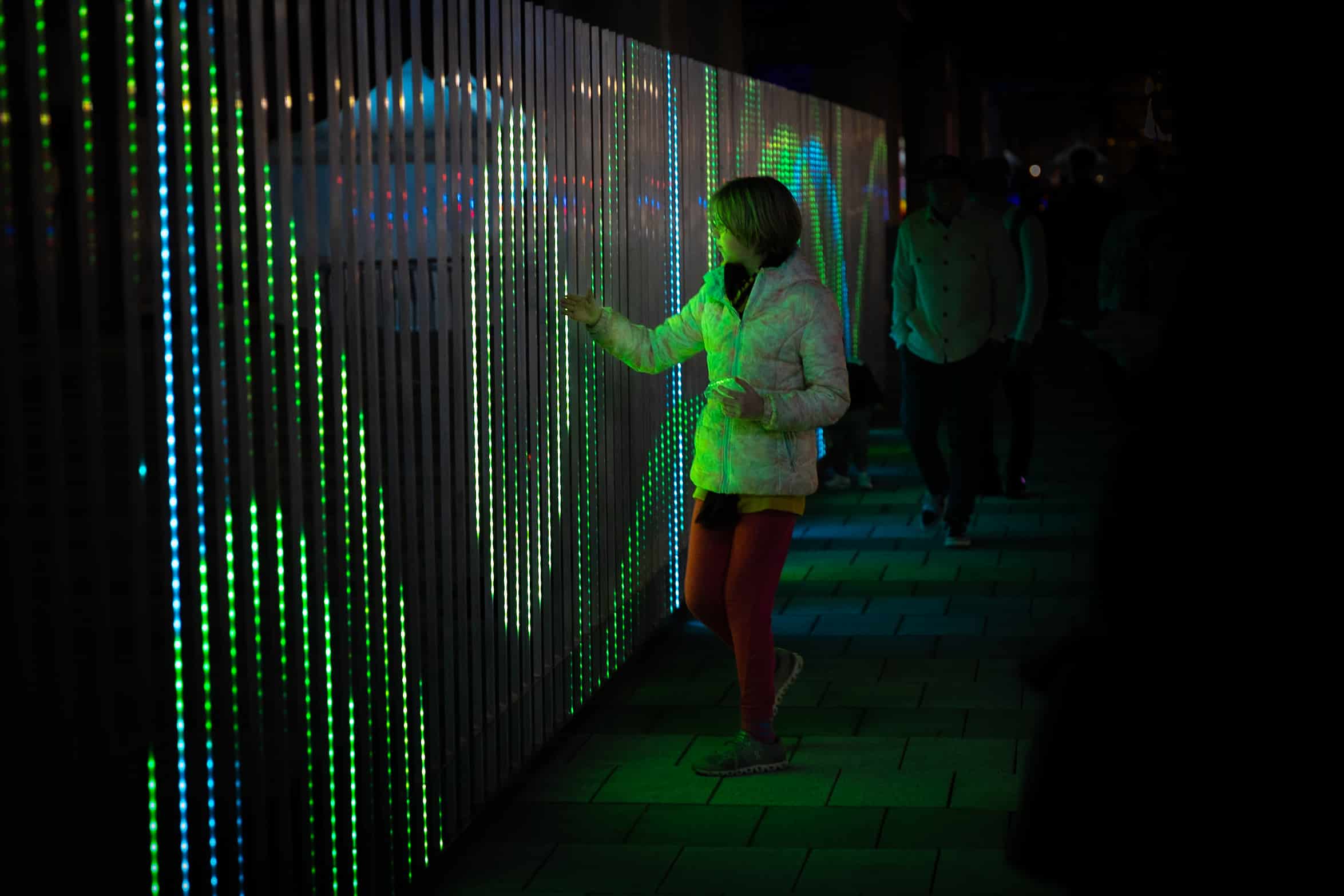 "Fences" is an interactive light installation that translates movement into evolving, generative compositions of light. Spanning 72 feet and embedded with nearly 9,000 LEDs, the work responds in real time, layering shifting patterns of color, form, and brightness. Up close, visitors create intricate patterns through their movement, while from a distance, the installation becomes an ever-changing visual composition.