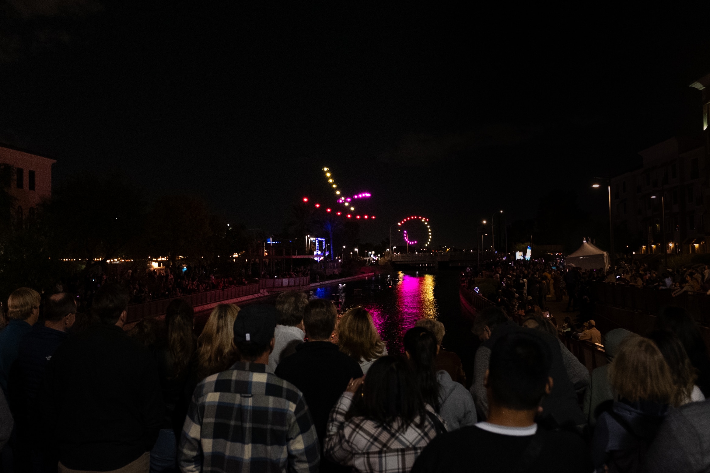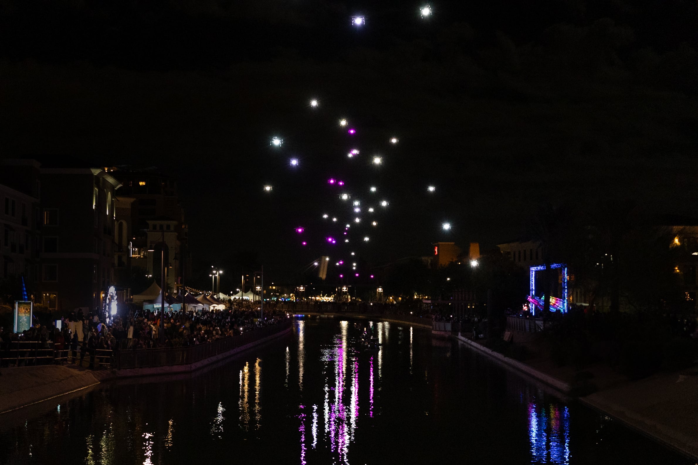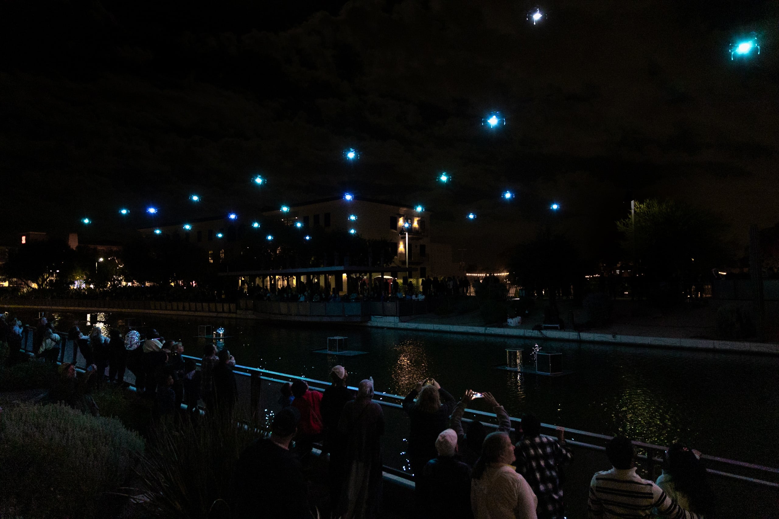 "Synthesis" is a kinetic light sculpture performed by drones, transforming the sky into an immersive, generative composition that evolves from chaos to harmony. Unlike conventional drone displays, "Synthesis" is not a screen in the sky but an aerial composition performed in the round, with viewers surrounding the work on all sides. The performance unfolds in waves, shifting from disorder to symmetry, as drones form evolving patterns of movement and light.