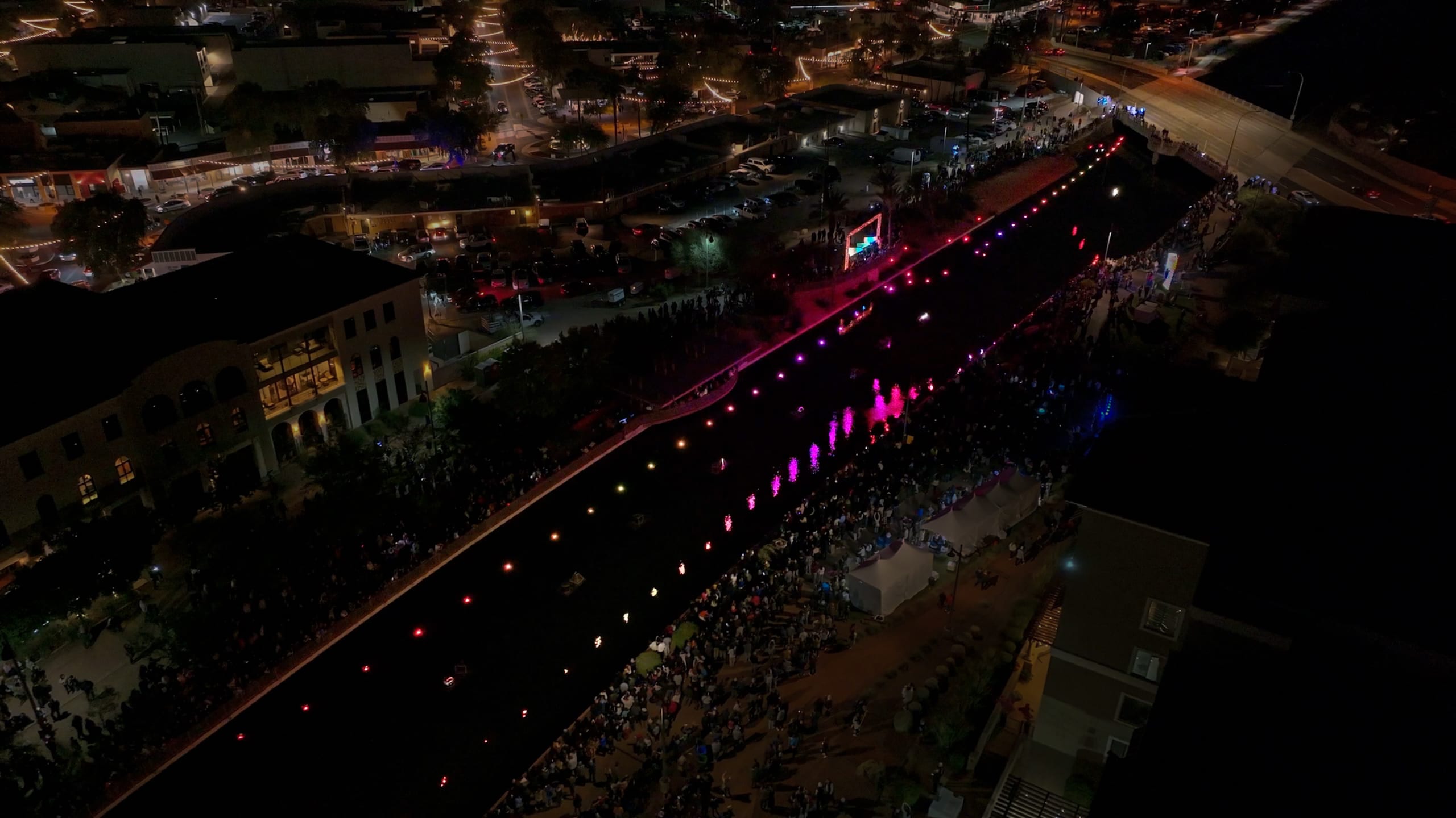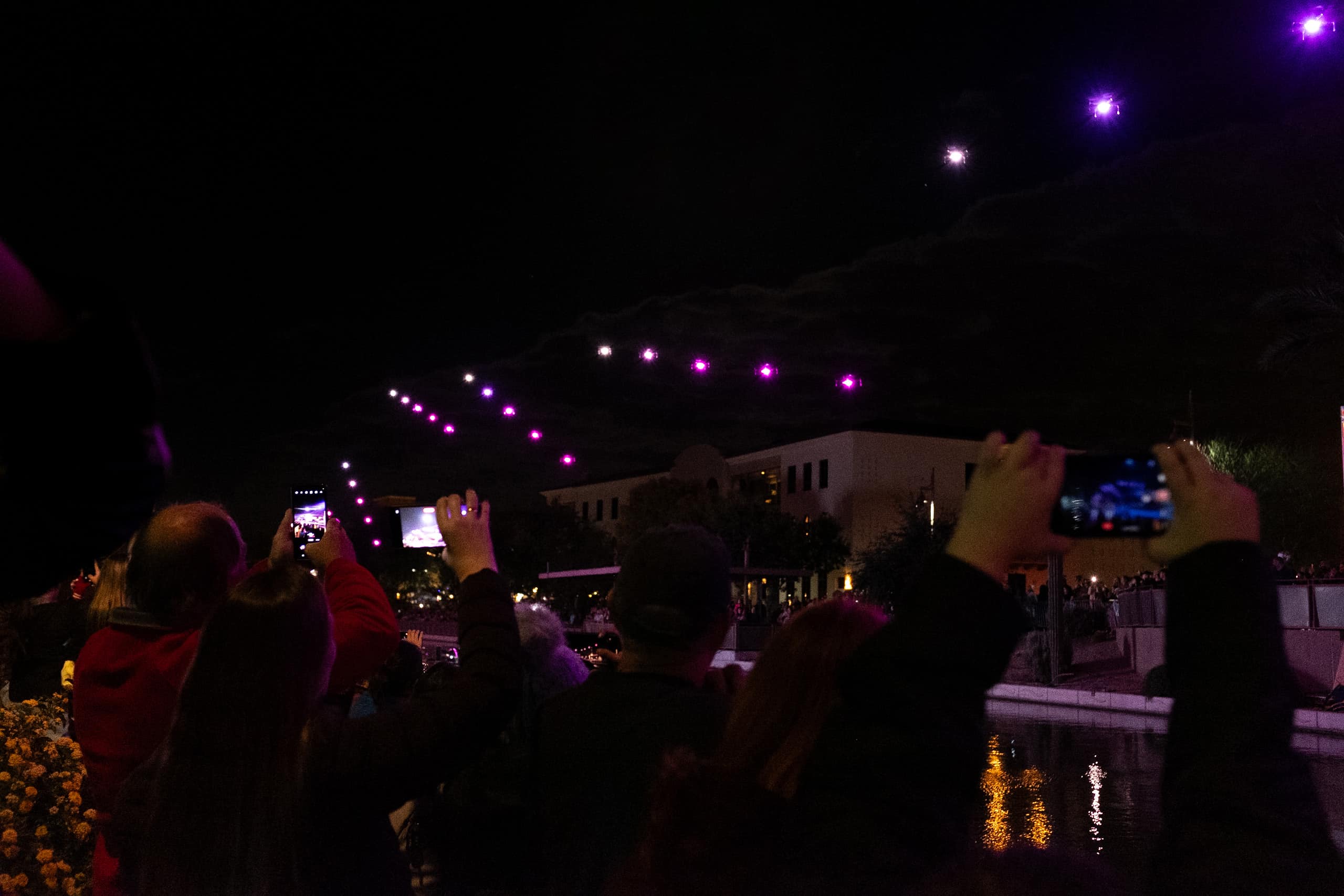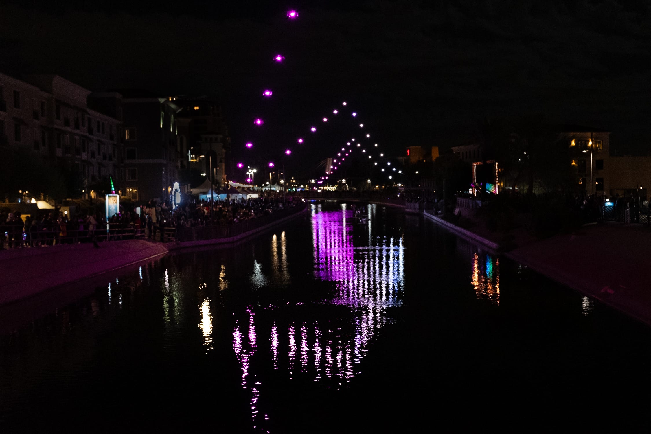 "Synthesis" is a kinetic light sculpture performed by drones, transforming the sky into an immersive, generative composition that evolves from chaos to harmony. Unlike conventional drone displays, "Synthesis" is not a screen in the sky but an aerial composition performed in the round, with viewers surrounding the work on all sides. The performance unfolds in waves, shifting from disorder to symmetry, as drones form evolving patterns of movement and light.